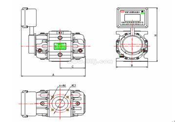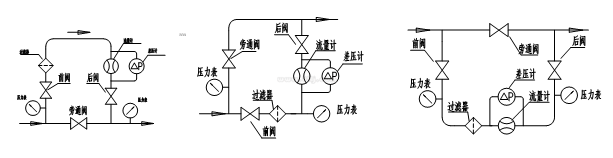 在特殊情况下可采取下进上出或左进右出,但订货时需特殊说明,流量计出厂时标准产品为上进下出。安装流量计时应设置前后阀门和旁通管路,以保证维修保养时,不必停气。图6、图7、图8分别为A、